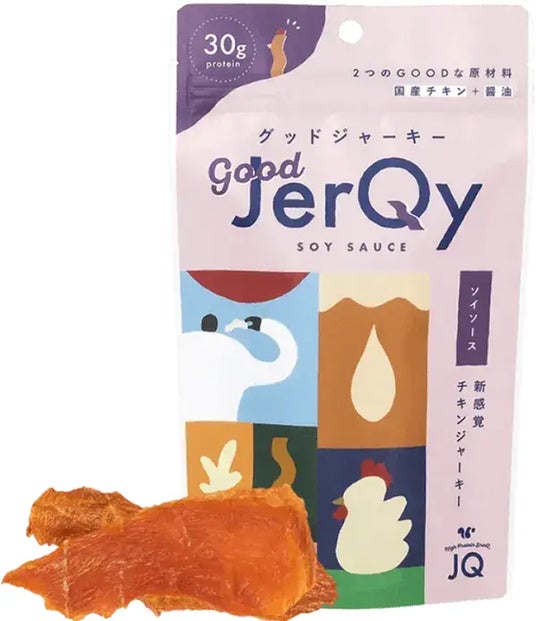グッドジャーキー ソイソース濃口醬油を染み込ませた、誰にでも愛されるやみつきフレーバー。鶏肉と醤油だけのシンプルさが奥ゆかしいうまみを深めます。