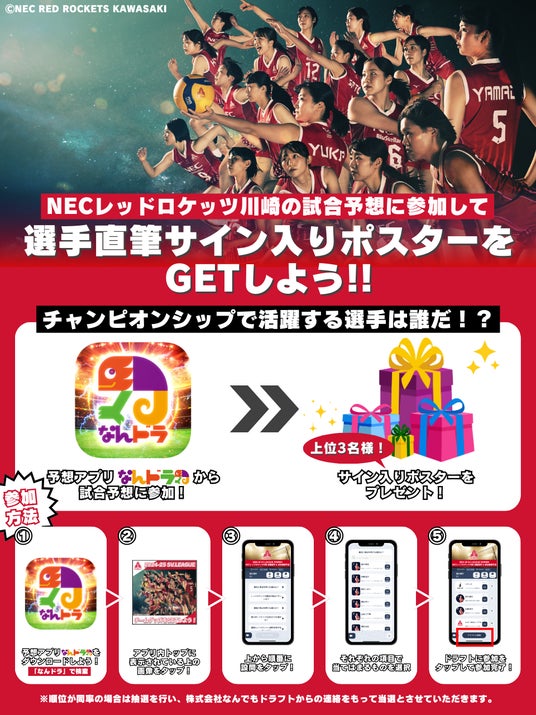 イノベーションの力で新たなスポーツ・エンターテインメントを創造し、まだ見ぬ感動と熱狂を提供するアプリ「なんドラ」を運営する株式会社なんでもドラフト(本社:東京渋谷区、代表:森井啓允)は、SVリーグ所属 NECレッドロケッツ川崎の4月25日(金)、26日(土)、27日(日)に開催される、チャンピオンシップ ホームゲーム(SAGA久光スプリングス戦)での活躍選手と試合展開の予想を開催中です。