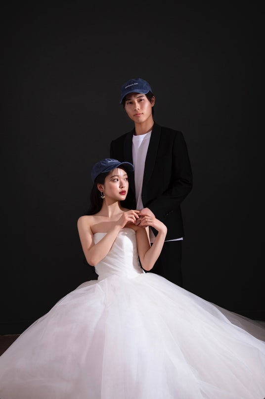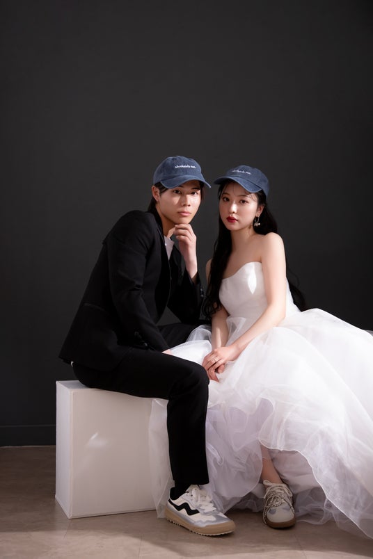 ウエディングスタイルであえてキャプとスニーカーを取り入れたファッショナブルなスタイリング。