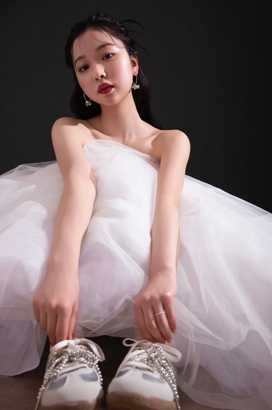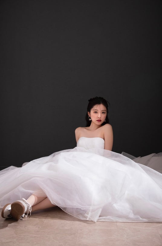 ボリューム感のあるドレスはモノトーンの中に存在感と透明感をプラスしてくれるワンランク上の上質な新衣装Premier lineを使用。