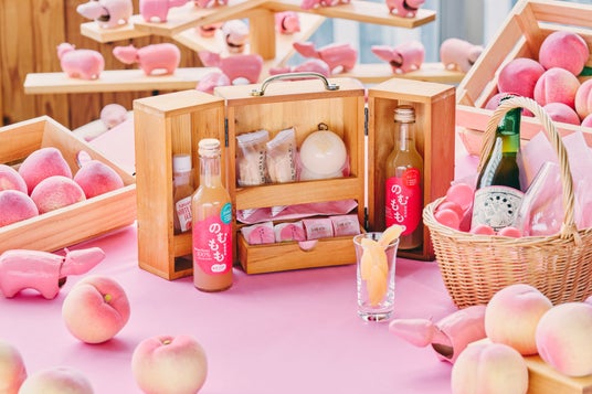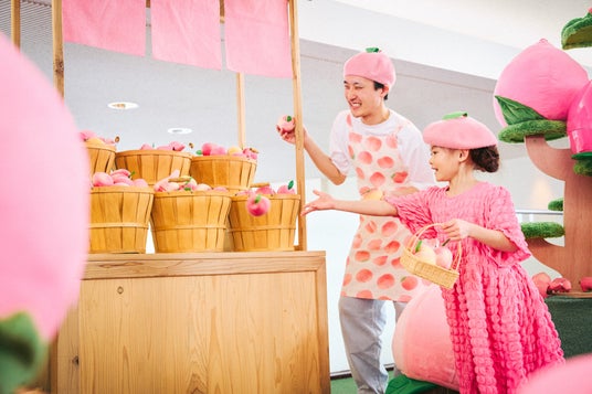 会場は、桃の木のモチーフや収穫用の木箱などが置かれ、桃の果樹園をイメージした空間です。大きな木箱に桃の実がいっぱいに入った「ももボールプール」では、まるで自分が収穫されたかのような写真が撮影できます。他にも、桃を木箱に投げ入ると景品がもらえる「もも収穫ゲーム」などのミニゲームもあり、お腹だけではなく、目も心も桃で満たされます。