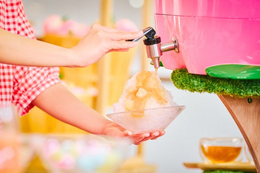 夏の定番スイーツかき氷を桃たっぷりで楽しめる、本企画恒例の「もも氷」。今年は、かき氷の上にかけるシロップとトッピングを、自分好みにアレンジできます。桃の果樹園をイメージした会場に登場するのは、桃シロップが入った実のなる木です。注文後、果肉の乗ったかき氷を受け取ったら、シロップの木から好みの桃の実を選び、シロップをかき氷にかけます。最後は、蜂蜜やジャムなどのトッピングを乗せ、自分好みの見た目や味わいにかき氷を仕上げて完成です。桃シロップの実は、「さっぱり桃シロップ」「あまい桃シロップ」「すっぱい桃シロップ」の3種から選ぶことができます。