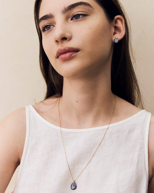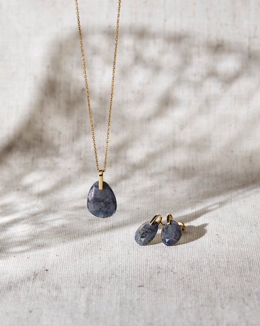 ネックレス¥40,700、ピアス¥41,800<ともにSV925(イエローゴールドメッキ)/ブラックラブラドライト>