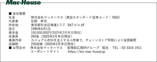 株式会社マックハウスは、全国に約250店舗を展開するファミリー向けカジュアル専門店です。「毎日着たくなる、ちょうどいい服」をコンセプトに、お手頃価格で高品質・多機能な商品を提案し、地域に根ざした店舗づくりを行っています。