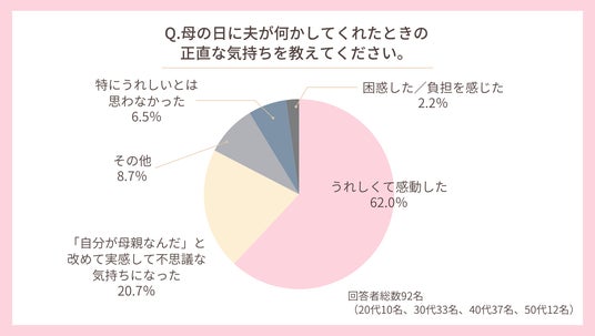 - 夫からの母の日に何かしてもらったときの気持ちは「うれしくて感動した」が62.0%