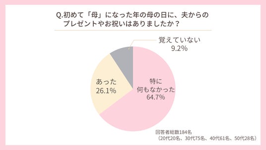 アンケート調査で「初めて母となった年の母の日に、夫からのプレゼントやお祝いはありましたか?」と尋ねたところ、もっとも多かった回答は「特に何もなかった」64.7%でした。