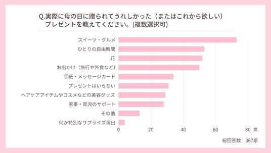 アンケート調査で「実際に母の日に贈られてうれしかった(またはこれから欲しい)プレゼントを教えてください。」と尋ねたところ、以下の結果となりました。