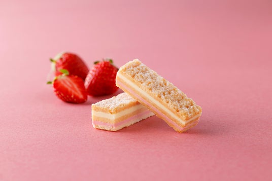 いちごの酸味とカスタードの甘みをイメージした2種のフィリングをサクサクのプレーンパイでサンドしました。
