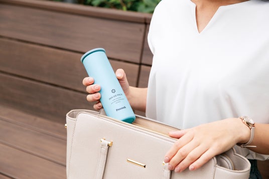 真空断熱構造のホルダーに入った冷たいまま持ち運べるシリコーン素材の氷のう。氷のう部分は水洗いが可能。