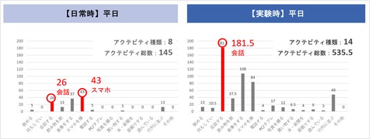 ●実験時は日常時よりアクティビティの種類が1.8倍、総数も3.7倍に増加