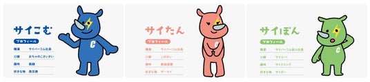 サイバーコムでは、「サイ」をモチーフにした3体のオリジナルキャラクターを制作しました。
