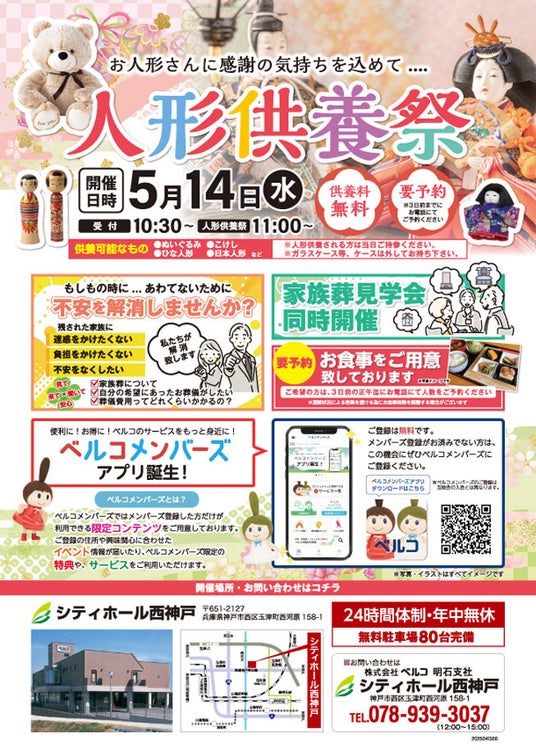 株式会社ベルコが運営する「シティホール西神戸」では、2025年5月14日(水)に「人形供養祭」を開催~家族葬見学会やご相談会も同時開催/参加無料・要予約~