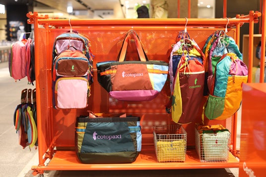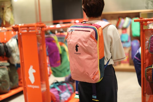 エスカレーターを上がってすぐ、目に飛び込んでくるのはCotopaxiならではのカラフルな世界。店内を彩るのは、ブランドのアイコン的存在である「Del Dia(デル ディア)」コレクションのアイテムたちです。