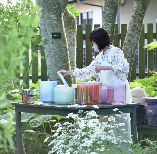 <音の葉 クリスタルボウル演奏>クリスタルのボウルを共鳴させて奏でる繊細な音色を、ガーデンの緑の中でお楽しみください。