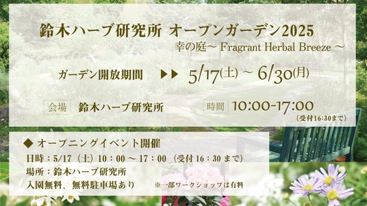 株式会社鈴木ハーブ研究所は、2025年5月17日(土)~6月30日(月)の期間を「第11回 オープンガーデン 幸の庭 ~Fragrant Herbal Breeze~」とし、500種類以上のハーブが育つハーブガーデンを無料で一般開放いたします。初日の5月17日(土)にはオープニングイベントを開催し、ワークショップやマルシェ、地元学生によるライブペイントなどを行います。また、ガーデン無料開放期間中の6月末までさまざまな講座を開催します。1年の中でもっとも見頃を迎えるハーブガーデンの見学に、ぜひお立ち寄りください。