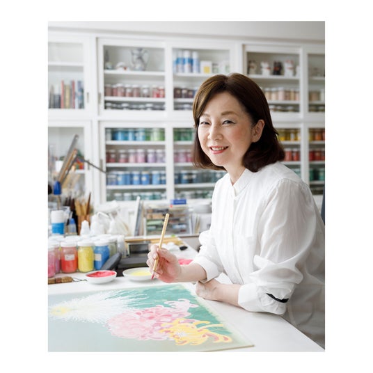森田りえ子氏は、日本の四季を彩る花々や 現代を生きる女性像を華やかな色彩と 卓越した描写力で表現する日本画家です。今回のデザインの「菊」は日本の皇室の紋章としても親しまれ、その花びらの重なりが奏でる美しいハーモニーを象徴しています。
