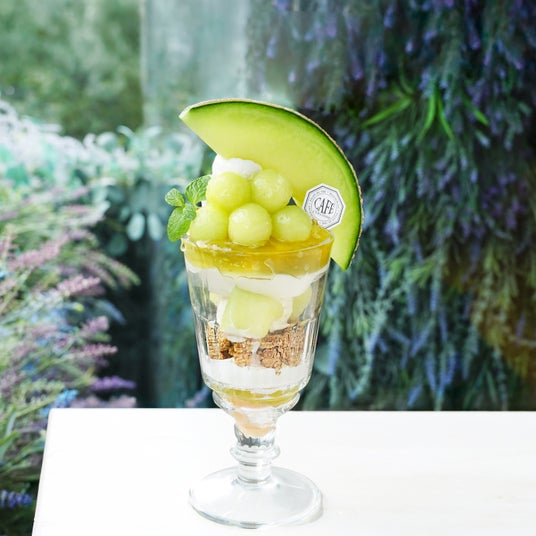 *軽井沢店では、ヴァーベナゼリー・バニラアイスクリーム・ホイップ・グラノーラが入った、「マスクメロンのヴァーベナパフェ」を1,680円で提供しております。
