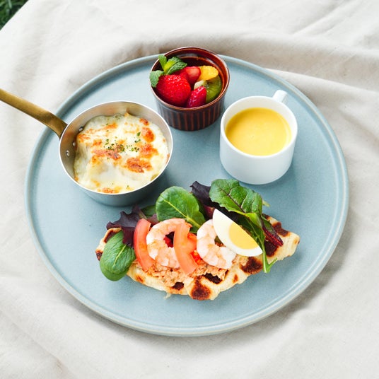 ファミリーで来店されるお客様も多い軽井沢店では、大人も楽しめるキッズプレートが限定で登場。主役は、シーフードのうまみたっぷりのクロワッサンワッフル、「エビとツナのタルティーヌ」。これに加え、ほくほくのジャガイモのグラタン、クリーミーなパンプキンスープ、季節のフルーツがワンプレートにのったキッズプレートです。色々な味を楽しめるので、「あれもこれも食べたい!」という想いを叶えます。