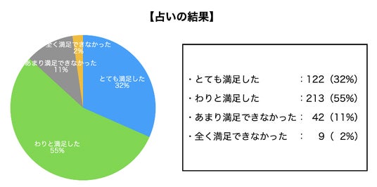 また、満足度も全体の87%が満足したと回答しており、占いを行なった多くの方が占ってもらって良かったという結果になりました。