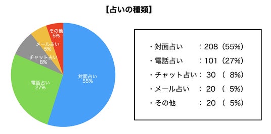 占いの種類では実際にお店に出向いて行う、対面占いが55%と半数以上を占めました。