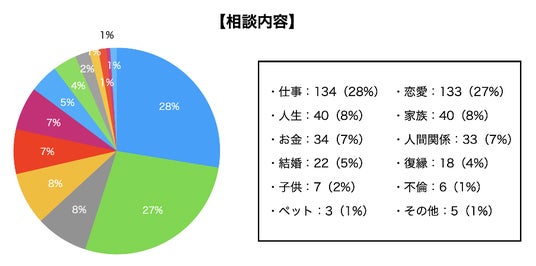 また、家族間の問題や人間関係、今後の人生・運勢やお金(金運)が次いで人気の相談内容となっています。
