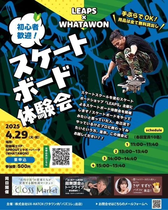 2025年4月29日(火・祝)、ライフスタイル複合施設「WHATAWON(ワタワン)」で開催される「CLOSS Market」当日、会場内の特設スケートエリアにて、初心者向けスケートボード体験会を実施いたします。プロライダーによる丁寧な指導と、必要な道具の無料貸出で、安心・安全にスケボーデビューが叶う特別企画。春の思い出に、家族や友達と一緒にチャレンジしてみませんか?