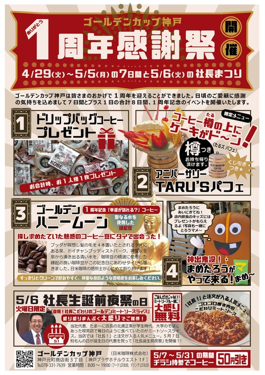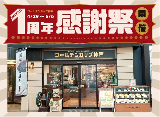 神戸にて93年の歴史を誇る日米珈琲株式会社(本社:兵庫県神戸市、代表取締役:北浦 正英)の直営喫茶店『ゴールデンカップ神戸』は、2025年4月29日(火/祝)にオープン1周年を迎えます。日頃よりご愛顧いただいている皆様へ感謝を込めて感謝祭イベントを4月29日(火/祝)~5月6日(火/祝)の8日間開催します。