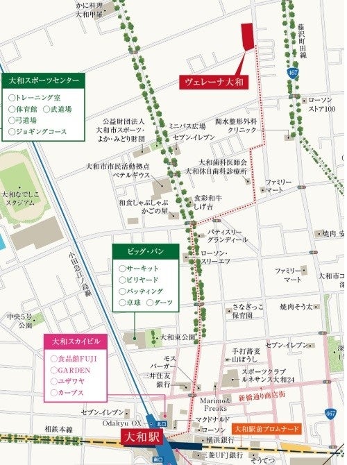 相鉄本線と小田急江ノ島線の2路線が交わる「大和」駅が最寄りで、駅周辺には「大和市文化創造拠点シリウス」や物件の周辺には「イオンモール」などの商業施設が充実。さらに、大和市は子育て環境の整備に注力し、多彩な暮らしに応える住環境です。「泉の森」や「瀬谷本郷公園」など自然に恵まれた環境も魅力です。