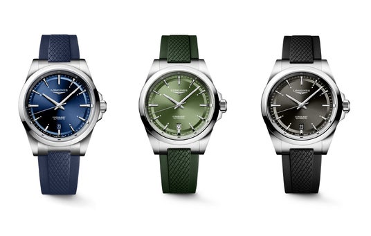 新作38mmと41mmのモデルでは、ロンジンの砂時計のモチーフをあしらい、微調整可能なダブルセーフティ フォールディングクラスプが付属した、グリーン、ブルー、ブラックのラバーストラップを採用。ステンレススティール製ケース、ストラップと同色のサンレイダイアル、シルバーのアプライドインデックスを組みあわせました。