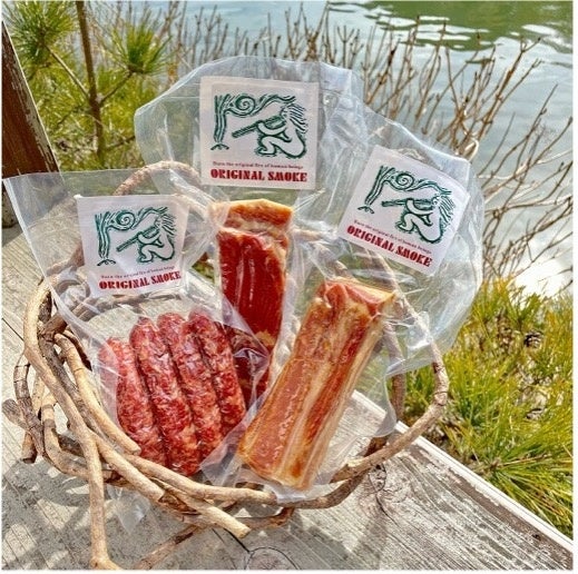 スモークハウス白南風「スモークベーコン」1986年頃創業のスモークハウス白南風は、創業者・青木章さんの自然の力に魅を入れられ真摯に向き合う心が、燻製づくりにも表れています。原木の火と煙でじっくりと時間をかけながら燻製し、素材そのままの風味を凝縮しています。味付けは塩と胡椒のみで、原木でじっくり燻製にするからこそ生まれる正直で素朴な素材そのものの美味しさです。知る人ぞ知る逸品で、多く美味しいもの好きに慕われています。
