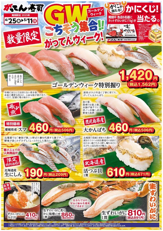 希少魚『愛知県産 スマ』、脂のり最上級『鹿児島県産大かんぱち』など、極上ネタを取り揃えた、ゴールデンウィーク特別握りを販売!さらに、各店6名様にカットずわいがに1kgが当たるかにくじも開催!