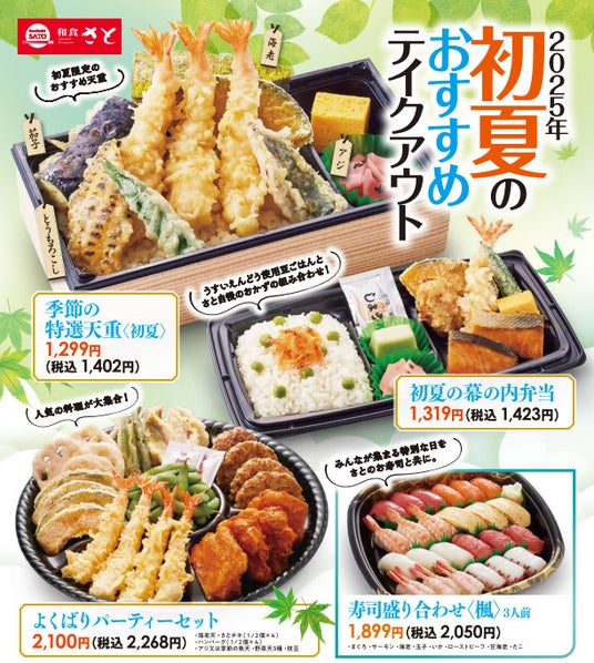 国内198店舗を展開する「和食さと」では、初夏限定のテイクアウトメニューを4月24日(木)より販売を開始します。今回も旬を迎えた「とうもろこし」や「茄子」の天ぷらなど、さわやかな初夏の味覚が詰まった「季節の特選天重」を税込1,402円で販売します。さとの天ぷらは米粉の入った天ぷら粉を使用し、サクサクと軽い食感が特徴です。海老3尾を使ったボリューム満点の特選天重は、ゴールデンウイークのごちそうにもおススメです。また、やさしい味わいの「豆ごはん」に海老天や焼魚・若鶏の唐揚げなど盛りだくさんのおかずを組み合わせた「初夏の幕の内弁当」を税込1,423円で販売します。「うすいえんどう」を使用した豆ごはんは、繊細な甘みとホクホクの食感がお楽しみいただけます。 いつも和食さとをご利用いただいている方も、初めての方も、ぜひ「さと」の初夏テイクアウトメニューでおうちごはんをお楽しみください!!