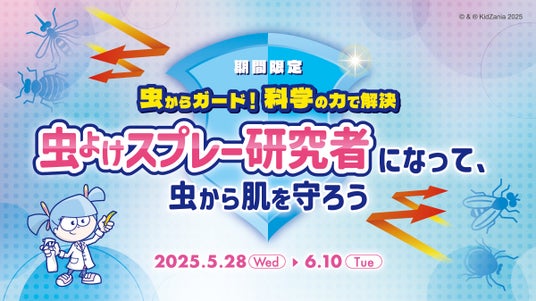アース製薬株式会社(本社:東京都千代田区、社長:川端克宜、以下 「アース製薬」)は6月4日「虫の日」に合わせて、KCJ GROUP 株式会社(本社:東京都中央区、代表取締役社長:圓谷 道成、以下 KCJ GROUP)が企画・運営を行うこどもの職業・社会体験施設「キッザニア東京」に、「虫よけ研究所」パビリオン(以下「本パビリオン」)を2025年5月28日(水)から6月10日(火)までの期間限定で初めてオープンします。