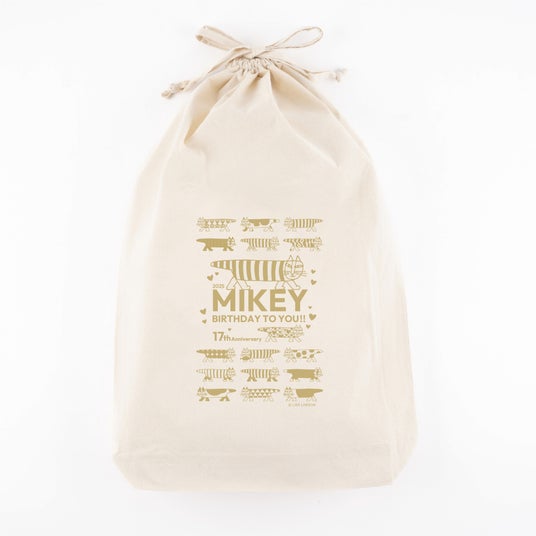 ここでしか手に入らない、「MIKEY BIRTHDAY TO YOU!! 2025」限定デザインの巾着(Lサイズ)に入れてお届けいたします。何が入っているかはお楽しみ!完全限定のお楽しみ袋です。