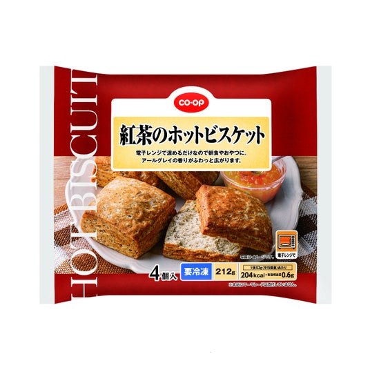 CO・OP 紅茶のホットビスケット 4個入(212g)ホットビスケットの外側のかりっとした食感と甘さもちょうどよく、特に紅茶の香りがしっかり感じられるのが、とてもおいしかったです。まずはそのまま食べて、アレンジとしてはオレンジジャムを添えるのもお勧めしたいです。