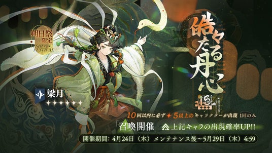 本召喚期間中、★6キャラクター「梁月(CV:水橋かおり)」、および★5キャラクター「ロガーヘッド(CV:広橋涼)」の出現率が大幅に上昇します。