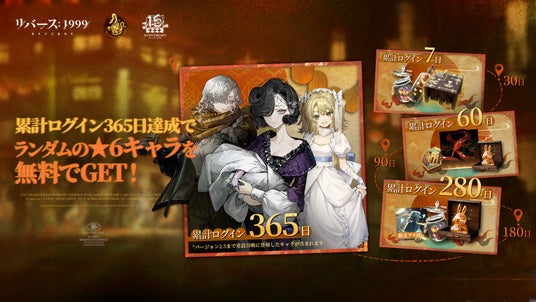 1.5周年を記念して、豪華なログインボーナスを多数ご用意しました。期間中ログインするだけで、限定コスチュームや召喚アイテム、育成素材など、豪華報酬をゲットできます。『リバース:1999』から皆様への感謝の気持ちとなりますので、ぜひログインしてお受け取りください。