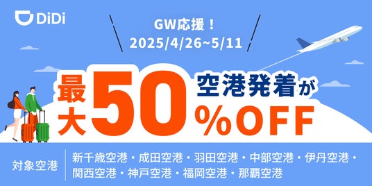 DiDiモビリティジャパン株式会社(本社:東京都港区、代表取締役社長:和久山 大輔)は、ゴールデンウィーク期間中の空港への移動をよりおトクにお楽しみいただくため、2025年4月26日(土)より、「GW応援!空港の発着が最大50%オフキャンペーン」を開始いたします。本キャンペーンでは、空港発着の乗車が毎回最大50%オフになります。ゴールデンウィークのお出かけにぜひディディをご利用ください。