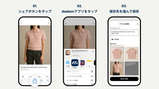 ブラウザ(Safari/Chromeなど)や写真アプリ、ブランド公式オンラインアプリのシェアボタンからdadamを選ぶとすぐに保存できます。