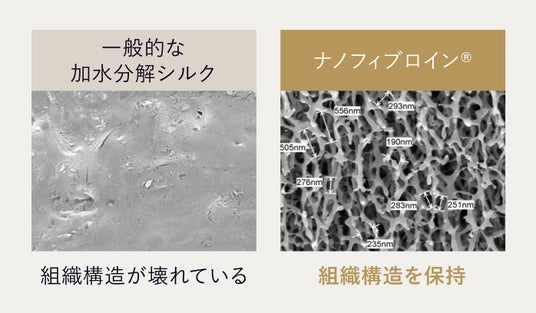 ナノフィブロイン(R)︎とは、特許技術※1により従来の加水分解シルクでは失われがちだった精緻な網目構造を保持した、高純度の水溶性フィブロインタンパク。シルク本来の高い保湿性、UVカット、メラニン抑制、そしてコーティング機能を実現。