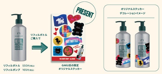 「リフィルステーション」対象店舗にてリフィルボトルを購入の方に数量限定のオリジナル限定ステッカーをプレゼント。自分だけのオリジナルリフィルボトルをカスタマイズできます。GAKU氏のアートに触れながらアートの持つ力を、またリフィルボトルを生活に取り入れることで環境を意識するきっかけ作りを全ての人の「可能性」に光を与える彼の作品を通じて、ザボディショップは多様な美しさや一人一人が自分らしく生きることの大切さを伝えていきます。