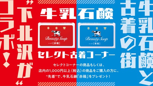 下北沢のカルチャーをリードする古着屋さんでは、店内に赤箱や青箱、石けんをイメージした古着を集めた牛乳石鹸タイアップコーナーを展開。コーナー内の商品をご購入いただいた方には、先着で赤箱をプレゼント。