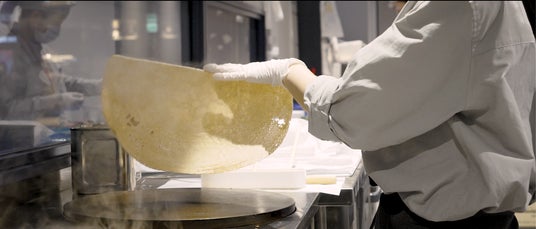 「クレープを手土産に」をコンセプトに、クレープは本来その場で食べる事が主流ですが、持ち歩きやすいようなサイズ感にすることで1人でもいろんな味を楽しめる”選ぶ楽しさ”も追及しました。そば粉100%の生地の上には色とりどりの食材が並び、食べ進めるごとに違った食感や味わいが楽しめるよう層が重なっています。甘いものから塩気のあるものまで、様々な食べ方で楽しんでいただけます。