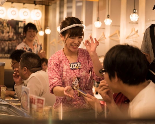 ・元気、活気、笑顔溢れる劇場型酒場 店内は博多中洲の屋台村を完全再現。祭り囃子をBGMに、粋の良いスタッフが創る熱気の渦を体感できるまさに“劇場型”の酒場です。