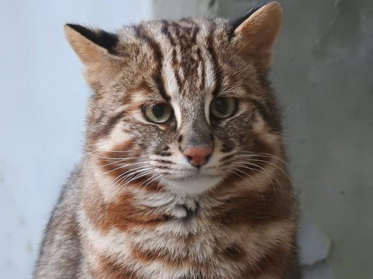 ツシマヤマネコは、韓国にほど近い長崎県の対馬にのみ生息する絶滅危惧種の猫。ふわふわの毛並みや短足胴長の体型、耳裏の白い斑紋などの特徴を、3トーンのブラウンカラーとメタル調のニュアンスで表現しました。