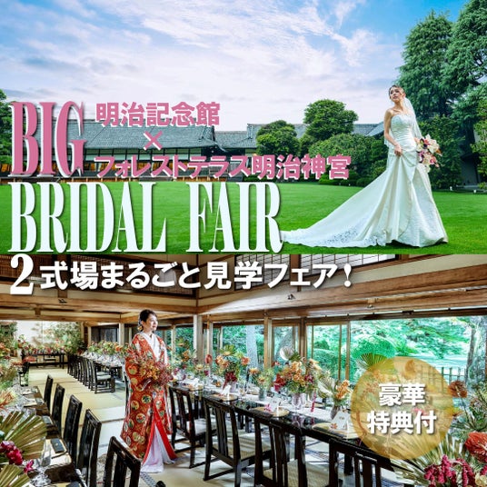 当館は、明治神宮外苑(明治記念館:港区)と、明治神宮内苑の境内(フォレストテラス明治神宮・桃林荘:渋谷区)にそれぞれ披露宴会場を有しています。4月26日(土)と27日(日)、5月3日(土)~6日(火)まで、組数限定で両式場を一日でご案内できる「2式場まるごと見学フェア」を特別に開催しています。
