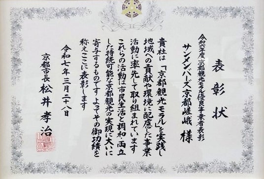 リゾートトラスト株式会社(本社:愛知県名古屋市、代表取締役社長:伏見 有貴)が運営する、「サンメンバーズ京都嵯峨」は、地域と共創し、地域の伝統産業を活かした体験プログラムや、小倉山の保全活動への参加など、持続可能な観光の実現につながる取り組みを展開し、令和6年度「京都観光モラル優良事業者」として表彰されました。当ホテルは昨年度に続き、2年連続の表彰となります。