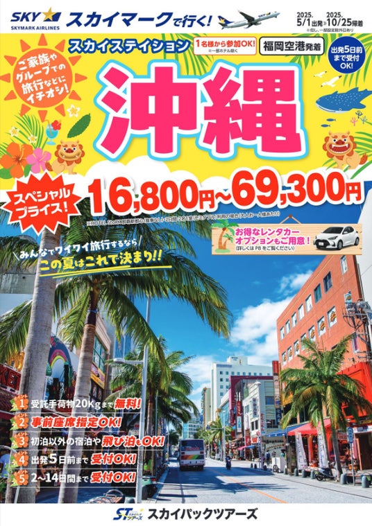 スカイパックツアーズ株式会社(本社:東京都中央区、社長:横山正巳)は、スカイマークを利用した価格固定型のパンフレット旅行商品「スカイステーション 沖縄」【福岡空港発着】(2025年5月1日出発~10月25日帰着)の販売を開始します。