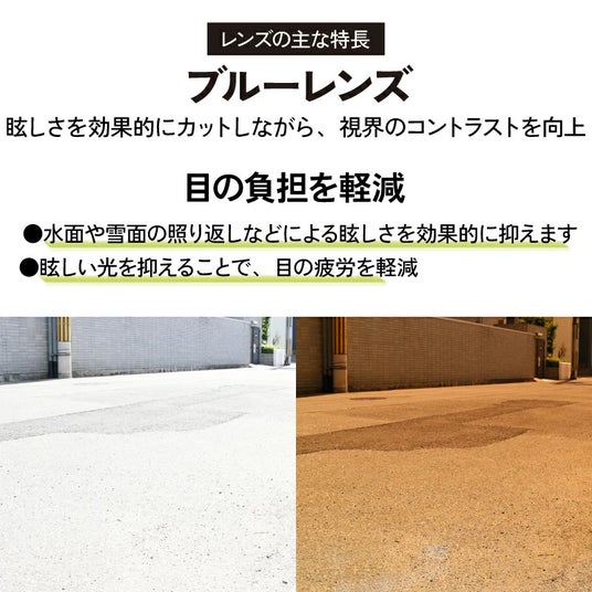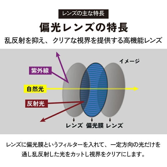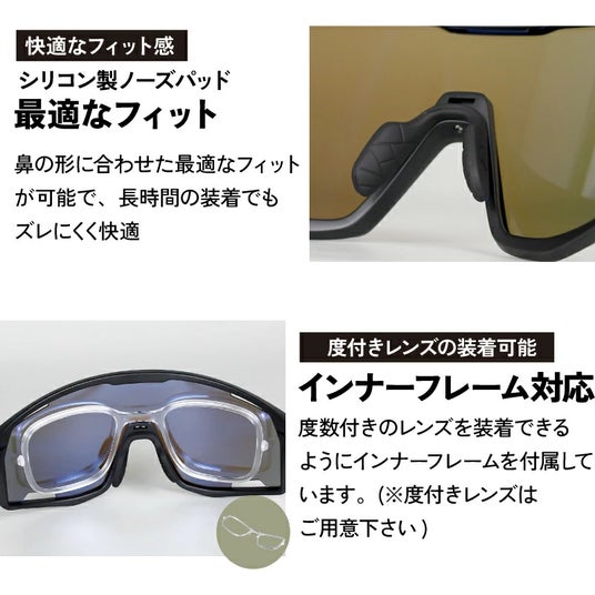TAC偏光レンズ/可視光透過率(VLT):8-18%/取り外し可能:可能/インナーフレーム装着:可能(度付きレンズ対応)/レンズコーティング:あり(100%コーティング)