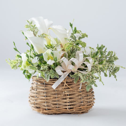●母の日ブーケ清楚な白い花々を、器に美しくまとめたスタンド型の上品なブーケ。
